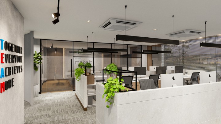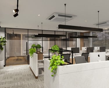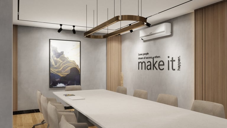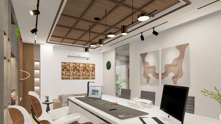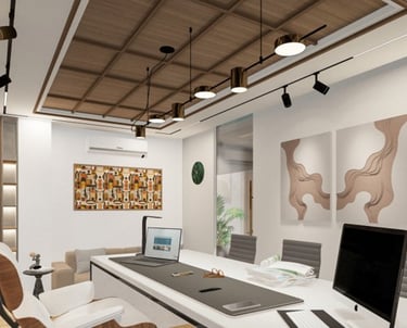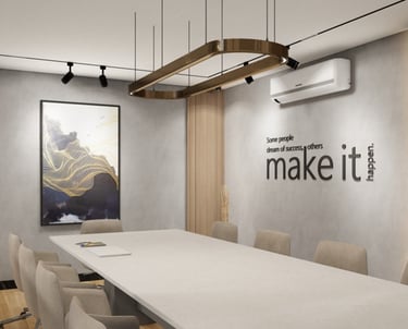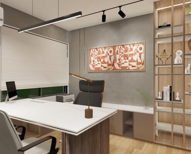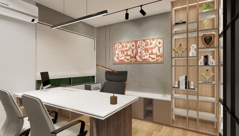 PROJECT DESCRIPTION Modern and functional corporate office. This fit-out strategically uses a sophisticated mix of wood and neutral materials to define executive privacy and open-plan collaboration, maximizing utility and professional aesthetic.